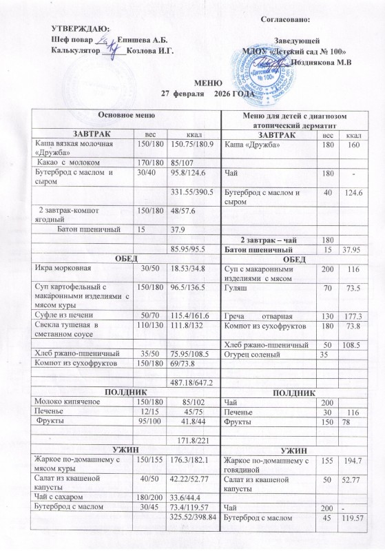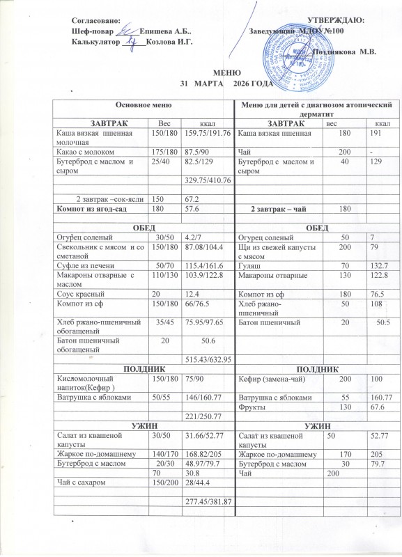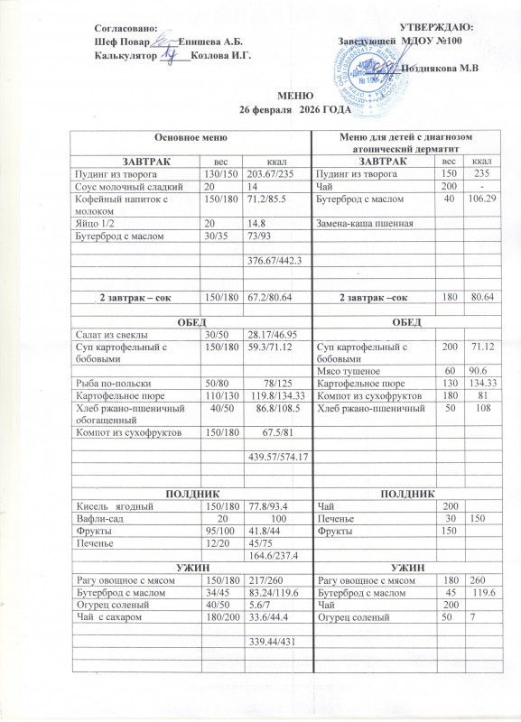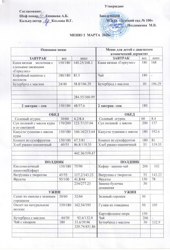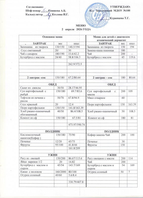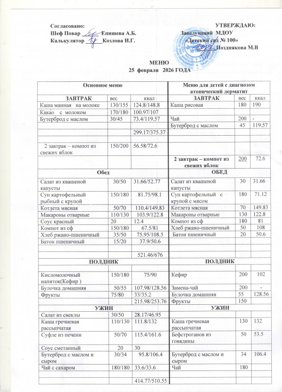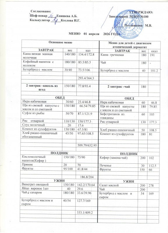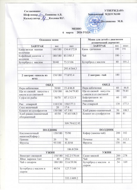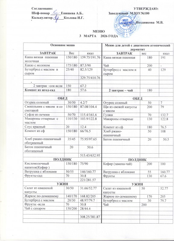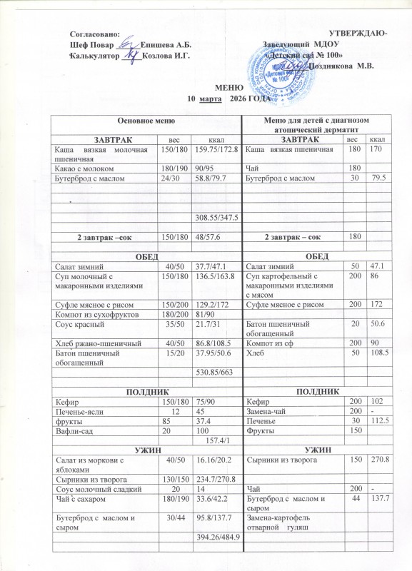 На основе цикличного десятидневного меню составляется ежедневное меню и утверждается заведующим детского сада.