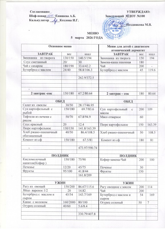 В МДОУ «Детский сад № 100» детям предоставляется сбалансированное пятиразовое питание в соответствии с утверждённым цикличным десятидневным меню, разработанным на основании санитарно-эпидемиологических правил и норм: