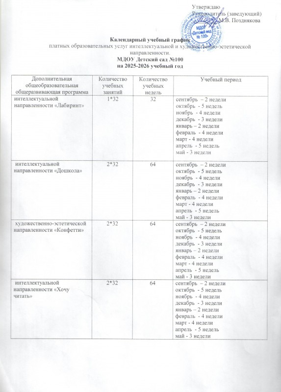 - Календарный учебный график платных образовательных услуг интеллектуальной и художественно-эстетической направленности МДОУ "Детский сад № 100" на 2025-2026 учебный год