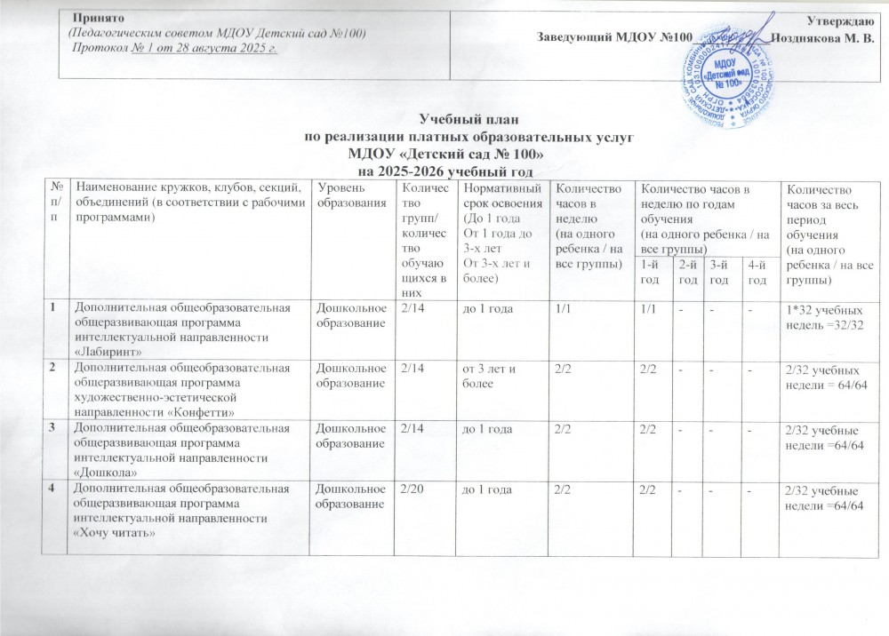- Учебный план по реализации платных образовательных услуг МДОУ "Детский сад №100" на 2025-2026 учебный год